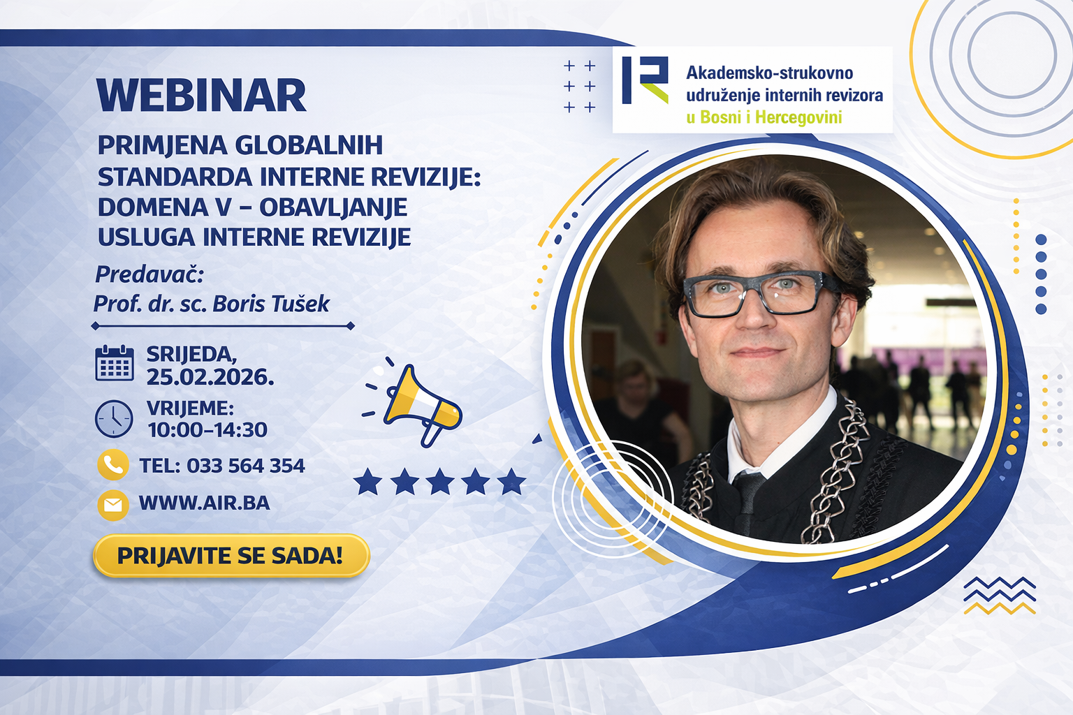 Pročitajte više: Webinar “Primjena GIAS – Domena V. Obavljanje usluga”📢 Akademsko-strukovno udruženje internih revizora u BiH organizuje webinar „Primjena Globalnih standarda interne revizije – Domena V. Obavljanje usluga“ 📅…