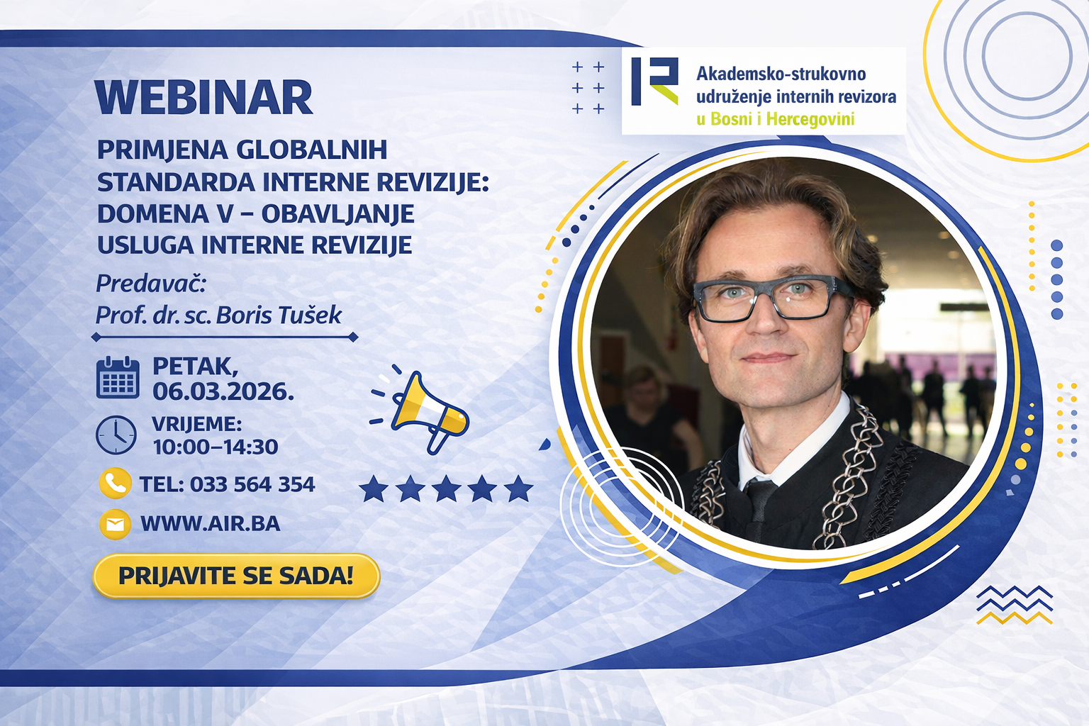 Pročitajte više: Webinar “Primjena GIAS – Domena V. Obavljanje usluga”📢 Akademsko-strukovno udruženje internih revizora u BiH organizuje webinar „Primjena Globalnih standarda interne revizije – Domena V. Obavljanje usluga“ 📅…